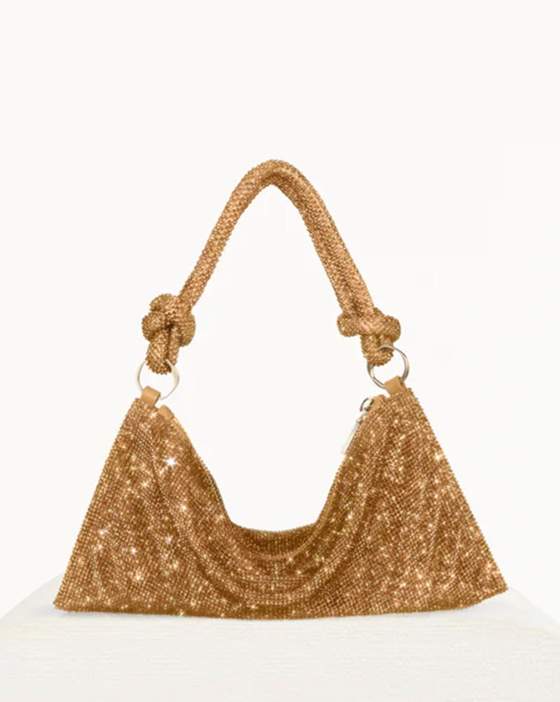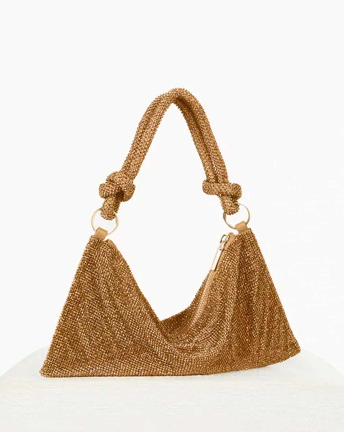 A trendy mini bag made with gold detailing, the perfect accessory to complete an elegant wedding outfit.