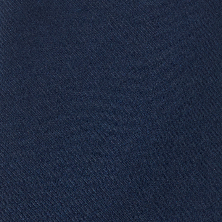 A solid navy silk tie that complements the suit, adding a touch of elegance to the ensemble.