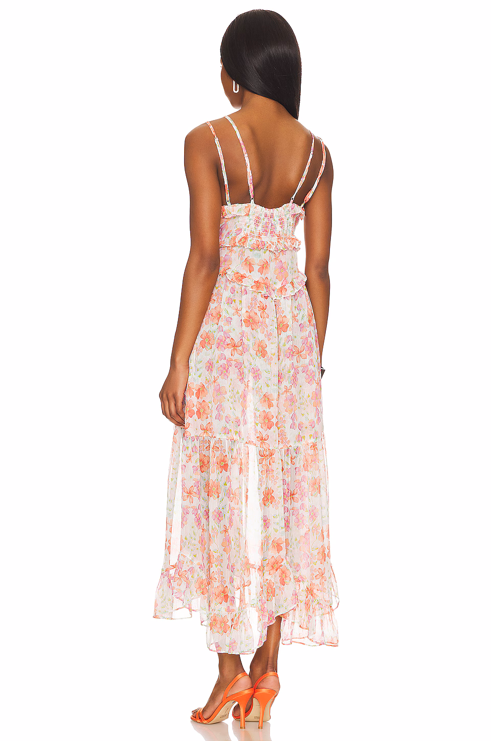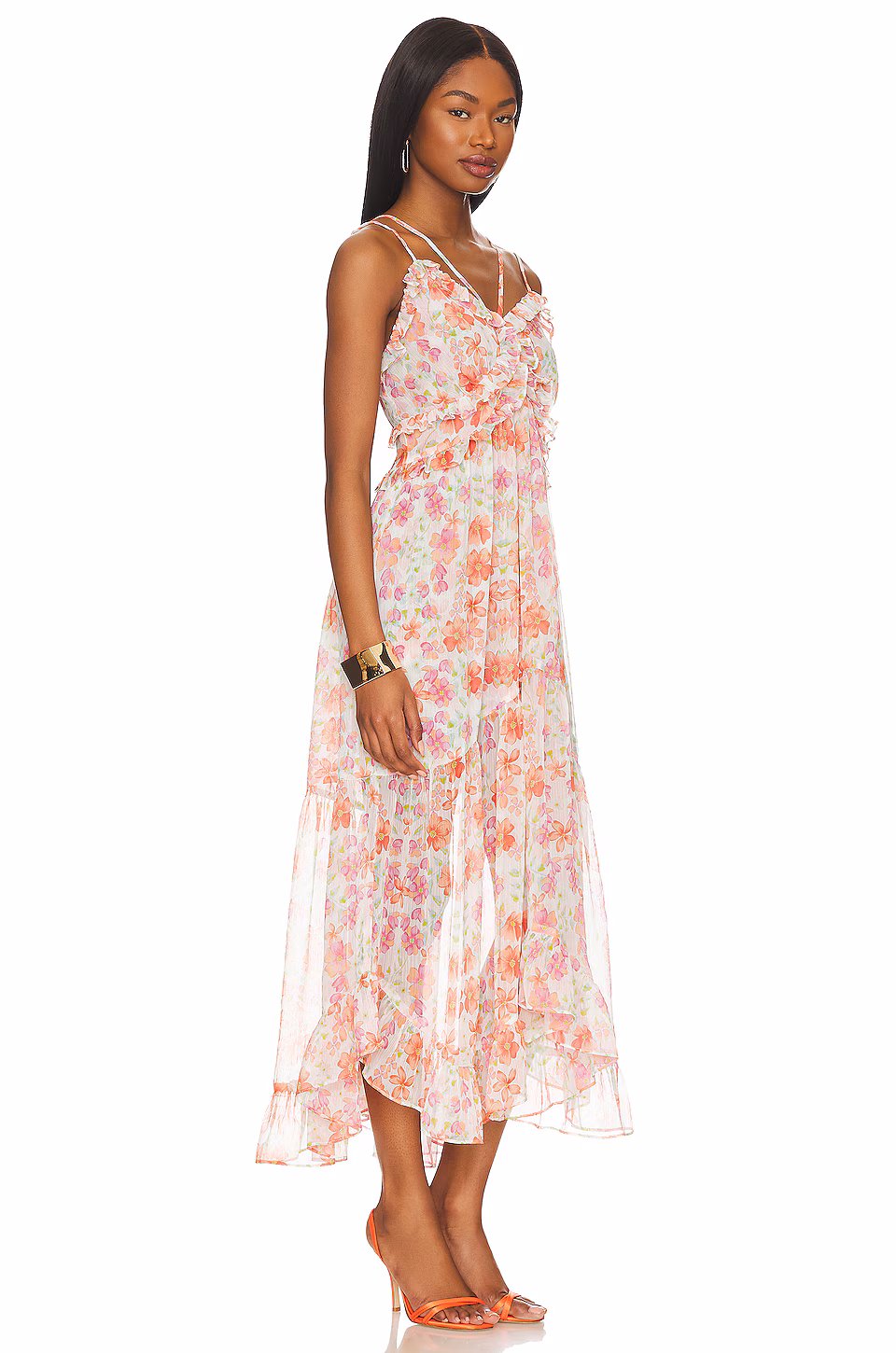 A beautiful floral print dress featuring ruffle details and a flattering silhouette, perfect for a wedding.